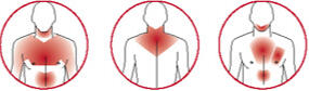manchmal Ausstrahlung des Schmerzes in den ganzen Brustkasten, gegen beide Schultern, Arme, den Hals, Unterkiefer oder Oberbauch